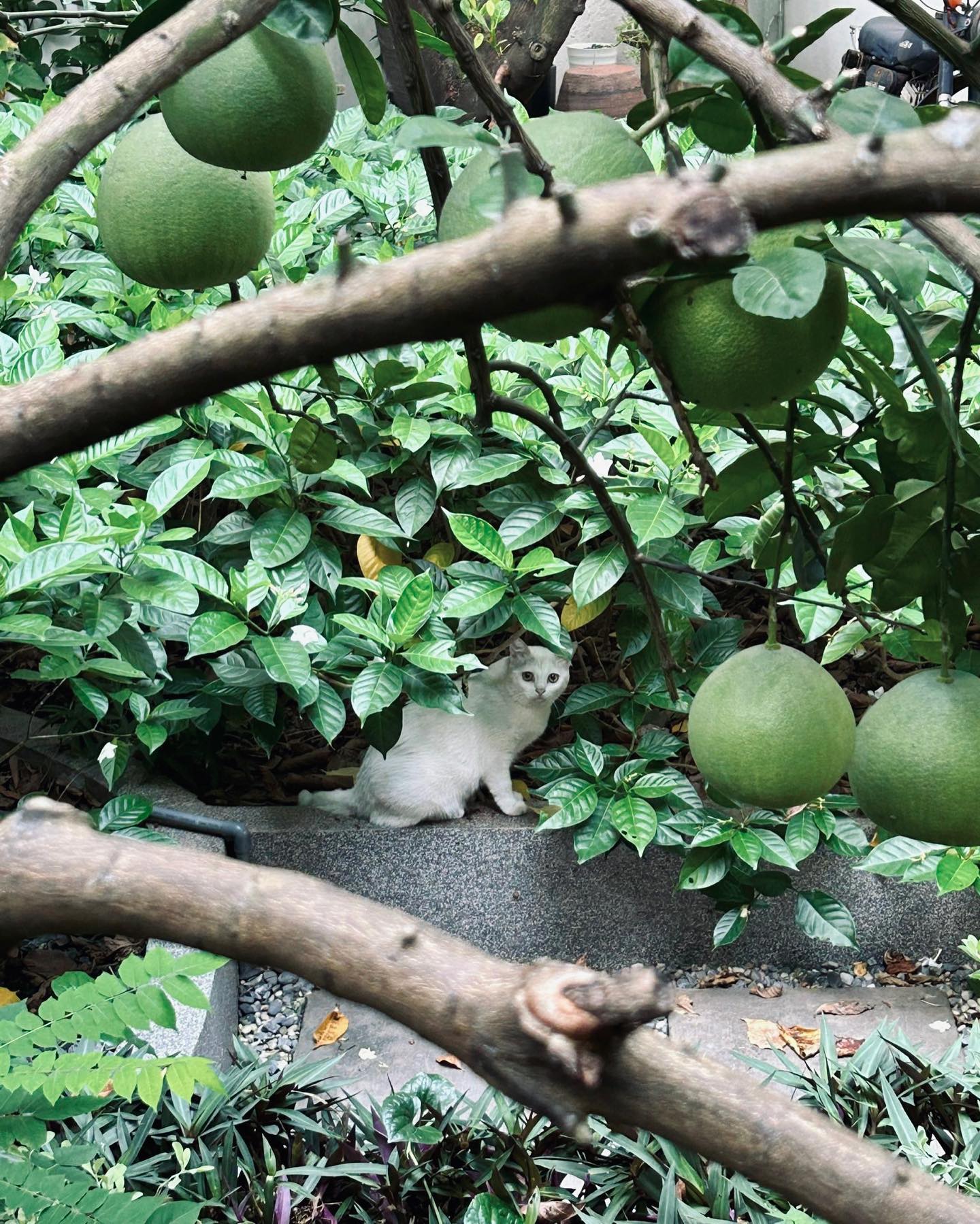 Ảnh cuối là bạn khách mới, diện áo trắng thơ thẩn dạo giữa khu vườn nhưng mặt hơi ngơ 🐱