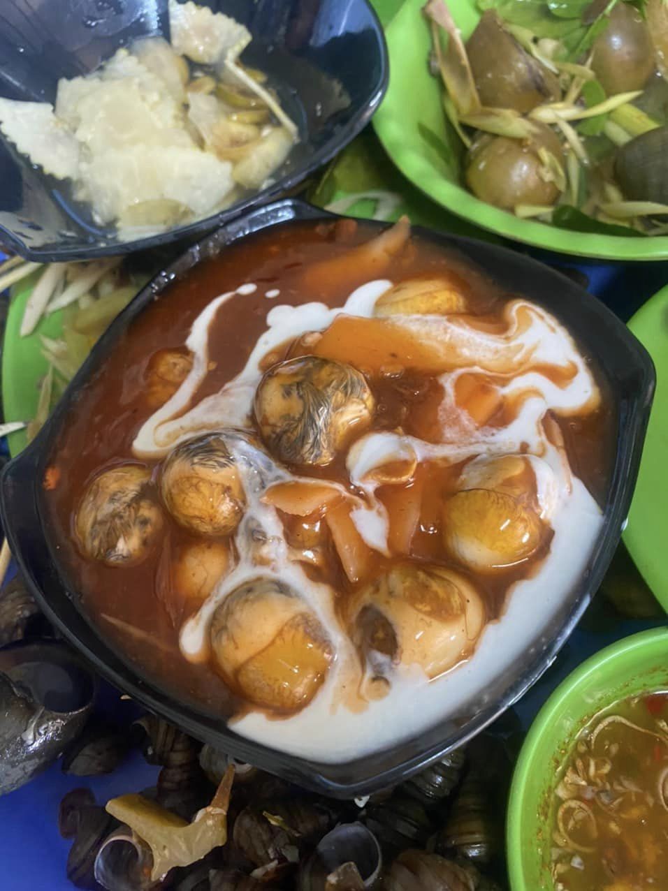 1. Ốc Hiền 517 Trần Hưng Đạo: ốc thì giòn ngon nhưng nước chấm mà theo khẩu vị của cái đứa ở HN lâu năm thì thiếu ngọt thiếu chua nên hơi mặn, món trứng cút xào me + cốt dừa khá ổn, khoai chiên bơ tỏi khá lạ miệng