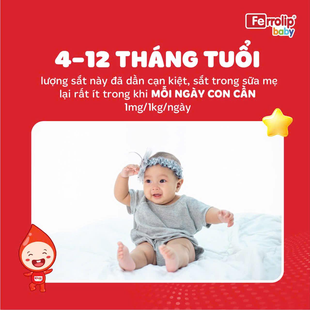 📌 4-12 tháng tuổi: lượng sắt này đã dần cạn kiệt, sắt trong sữa mẹ lại rất ít trong khi nhu cầu sắt của con ngày một tăng cao, lên đến 1mg/1kg/ngày.