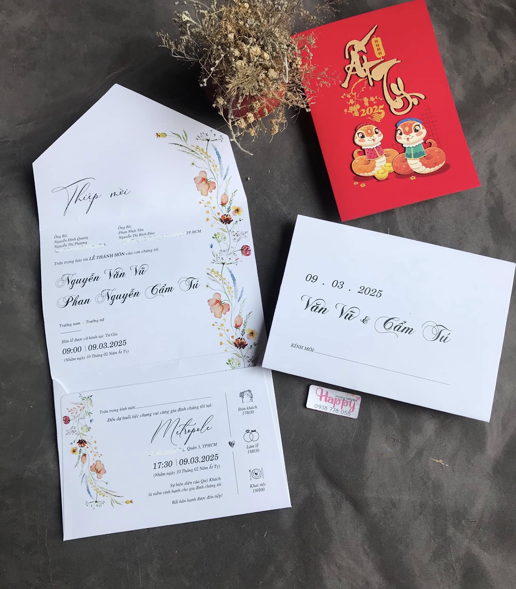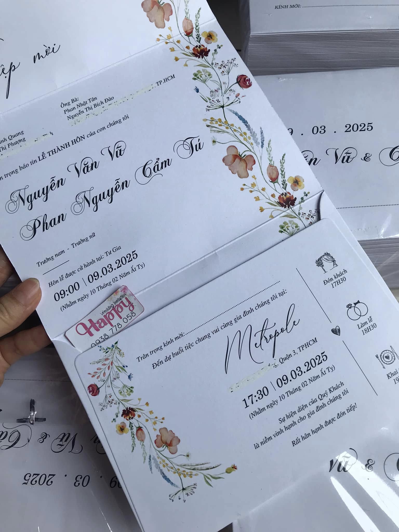 Thiệp gấp 3 trả khách, thiết kế theo yêu cầu dâu rể ạ