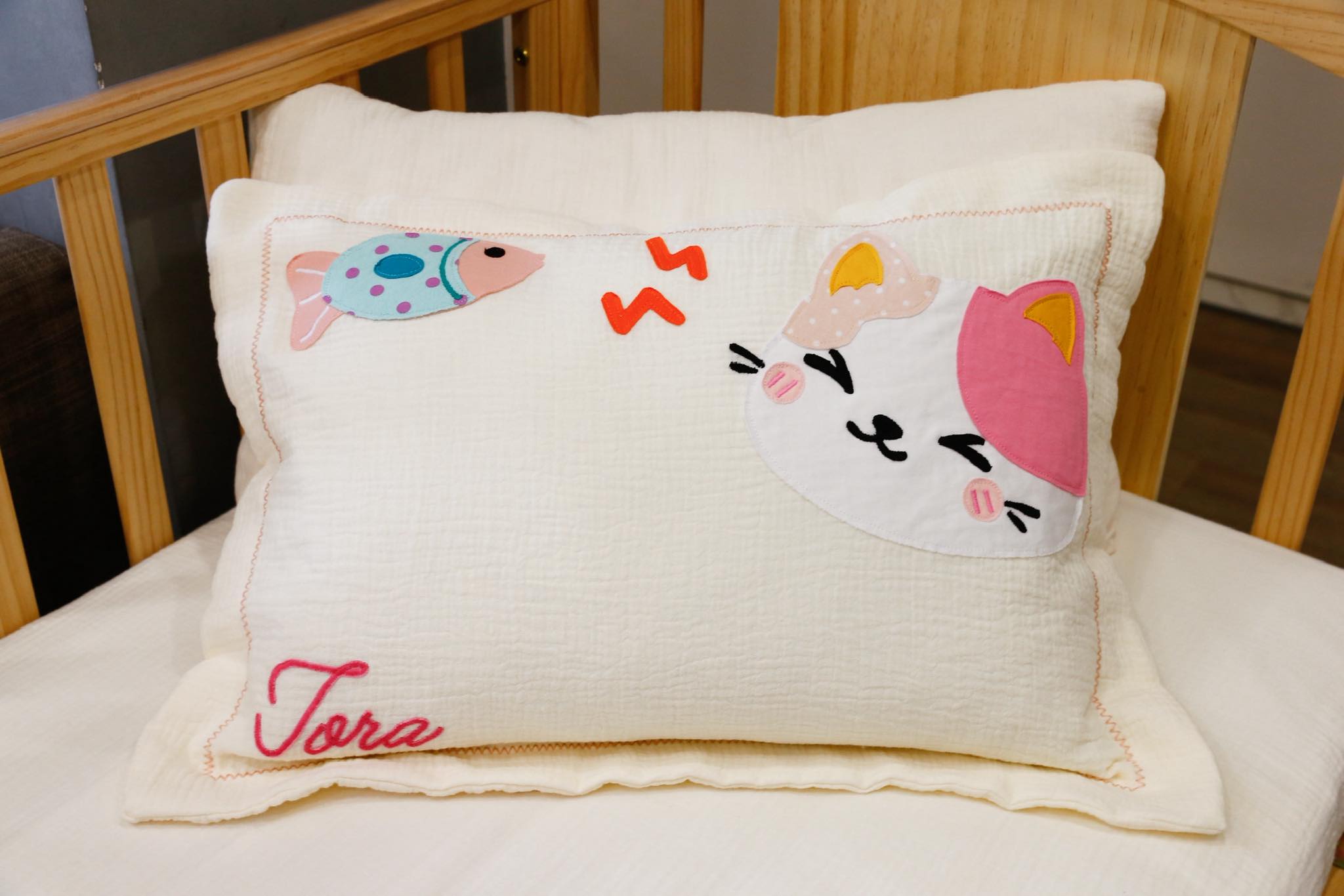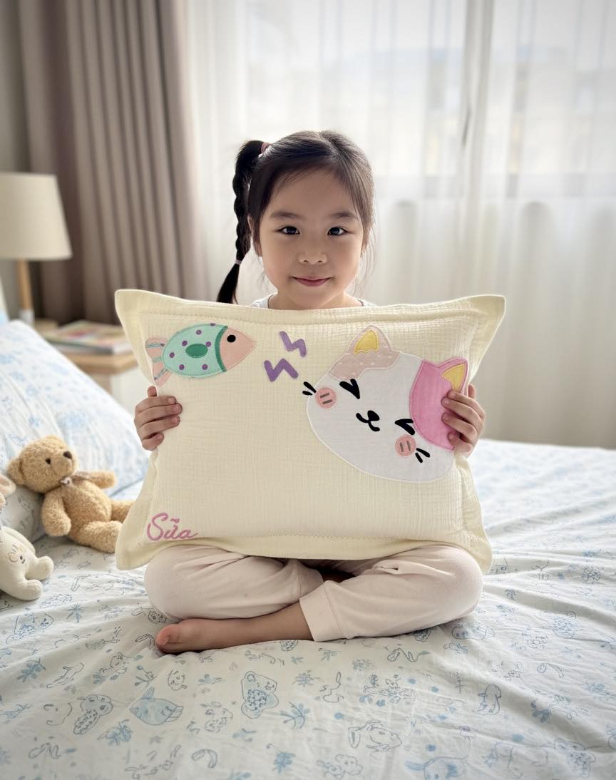 Bộ chăn gối Mèo hồng với hoạ tiết trang trí may rập thủ công vô cùng dễ thương cho bé 🥰