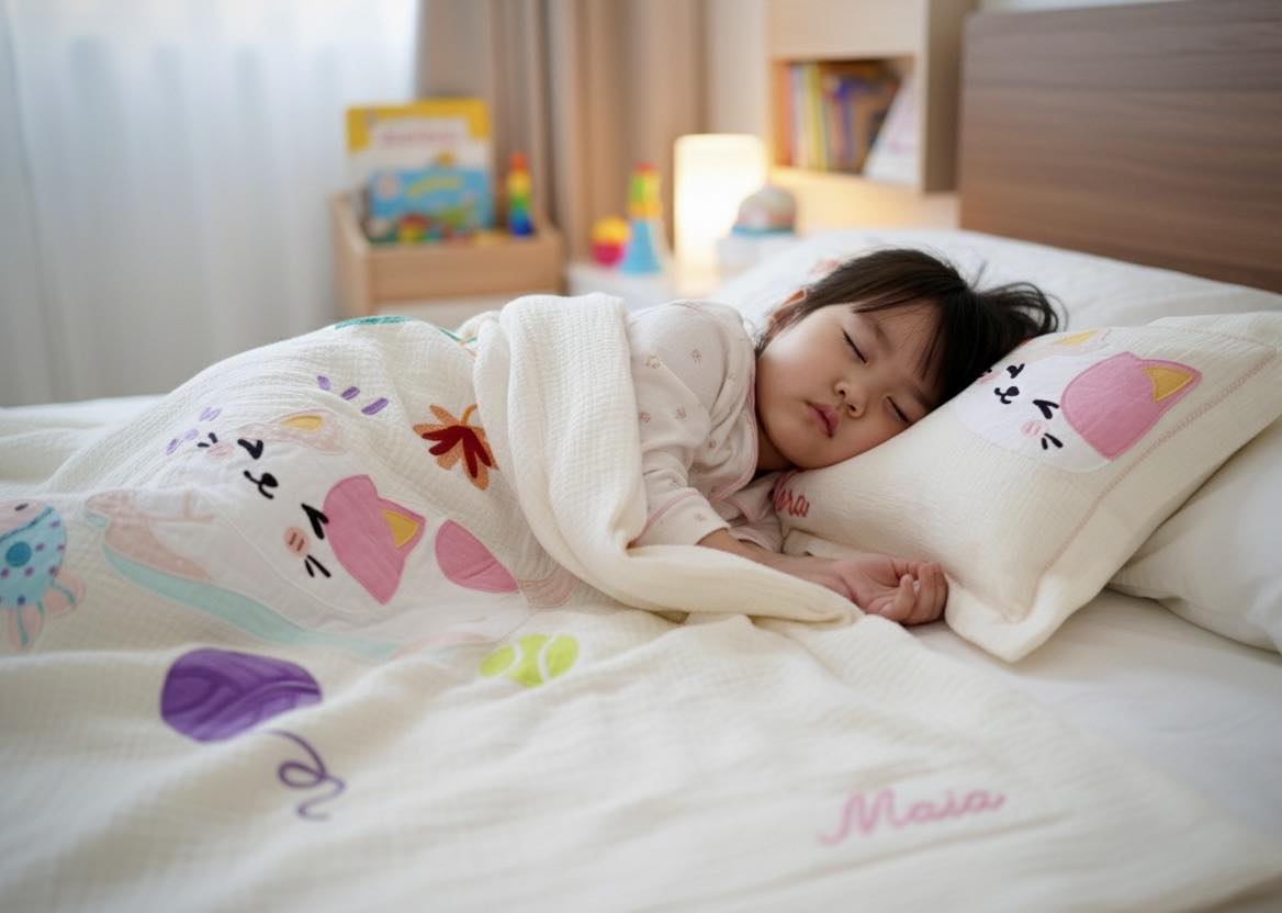 #Bộ #chăn #gối #Mèo #hồng #với #hoạ #tiết #trang #trí #rập #thủ #công #vô #cùng #dễ #thương #cho #bé #Chất #liệu #muslin #lớp #được #dệt #từ #sợi #bông #tự #nhiên #mềm #mạ