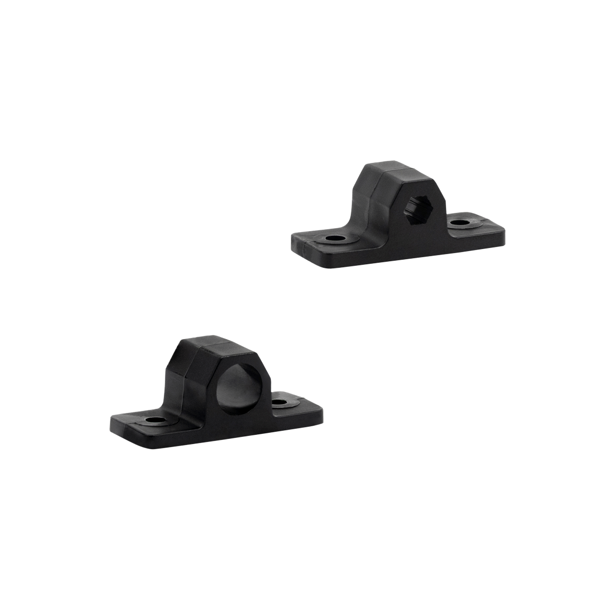 This bearing pillow block bracket (REV-41-1316) is used with the DUO Build System 15mm Extrusion. The hex center hole fits the 5mm hex shaft. This bracket has alignment ribs on the bottom which help align the bracket with the extrusion channel.
